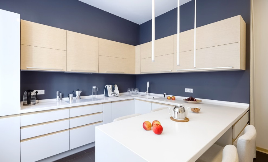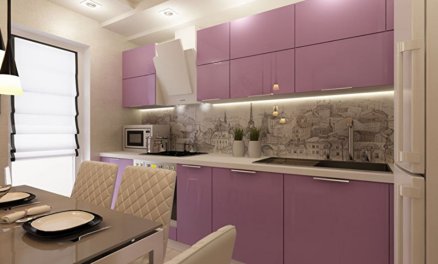 В маленькое помещение лучше не покупать кухонные гарнитуры холодного тона, например, синий, сиреневый и бирюзовый. Комната станет темной и у вас и ваших гостей пропадет аппетит.
