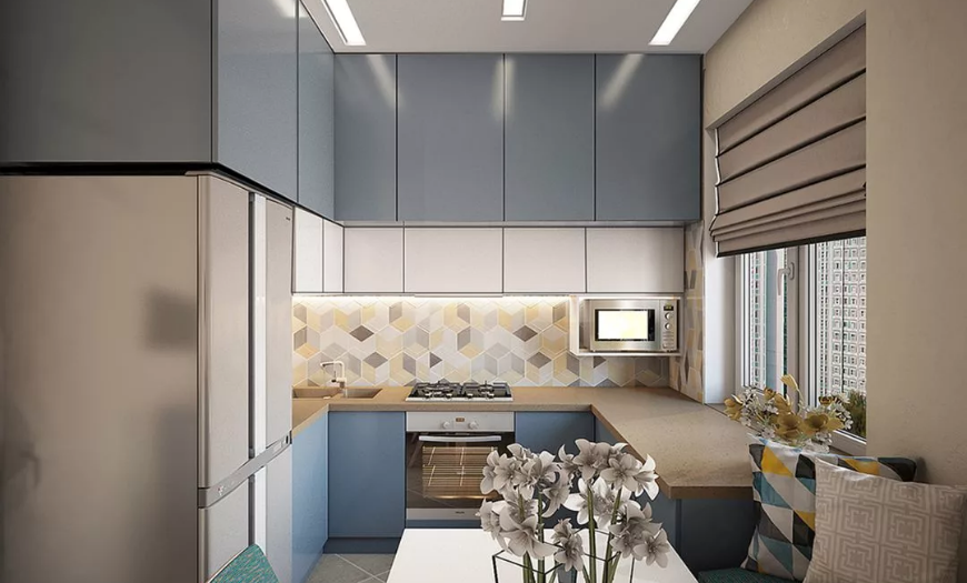 Смешение геометрических и плавных линий, а также использование глянцевых поверхностей поможет зрительно расширить маленькую кухню.