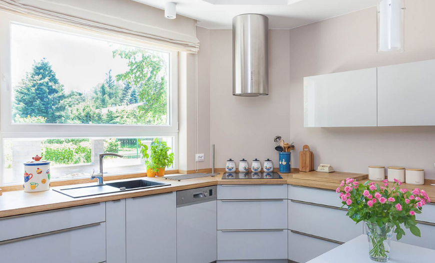 Если вы решили поместить в угол раковину, а окно находится прямо над раковиной, получится замечательный интерьер кухни. Кухня будет хорошо освещена, не придется тратиться много на ее освещение. Многие хозяйки любят такую планировку.
