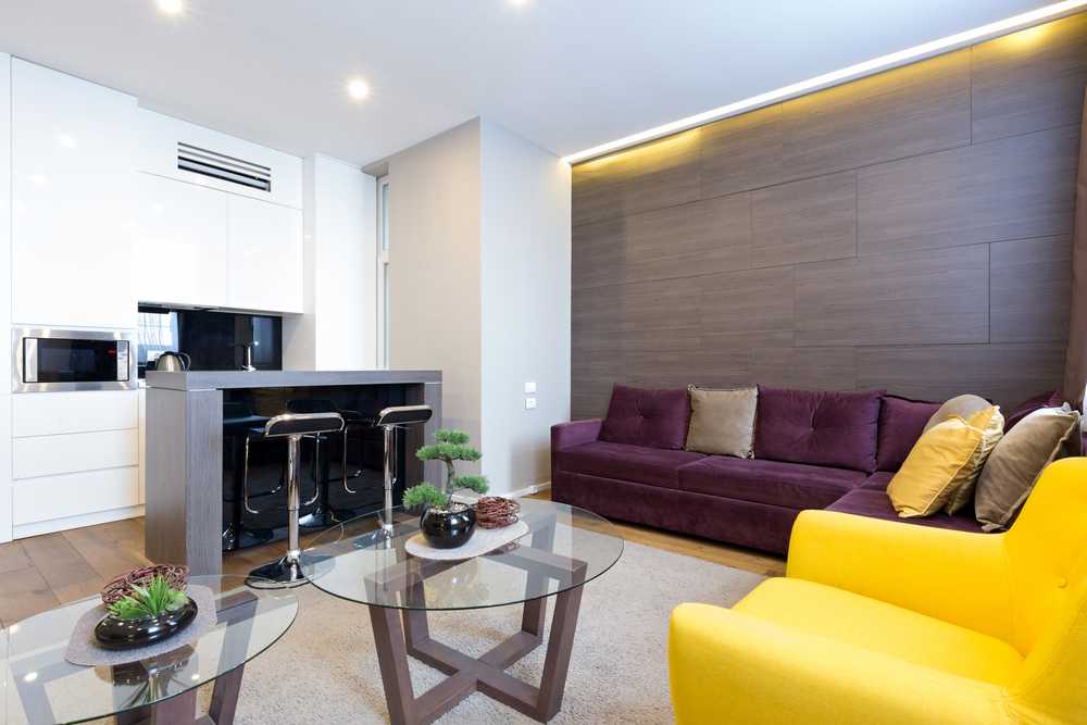 Если барная стойка достаточно большая, она служит обеденной зоной. Диван вместить не всегда возможно, но нескольких стульев будет достаточно.