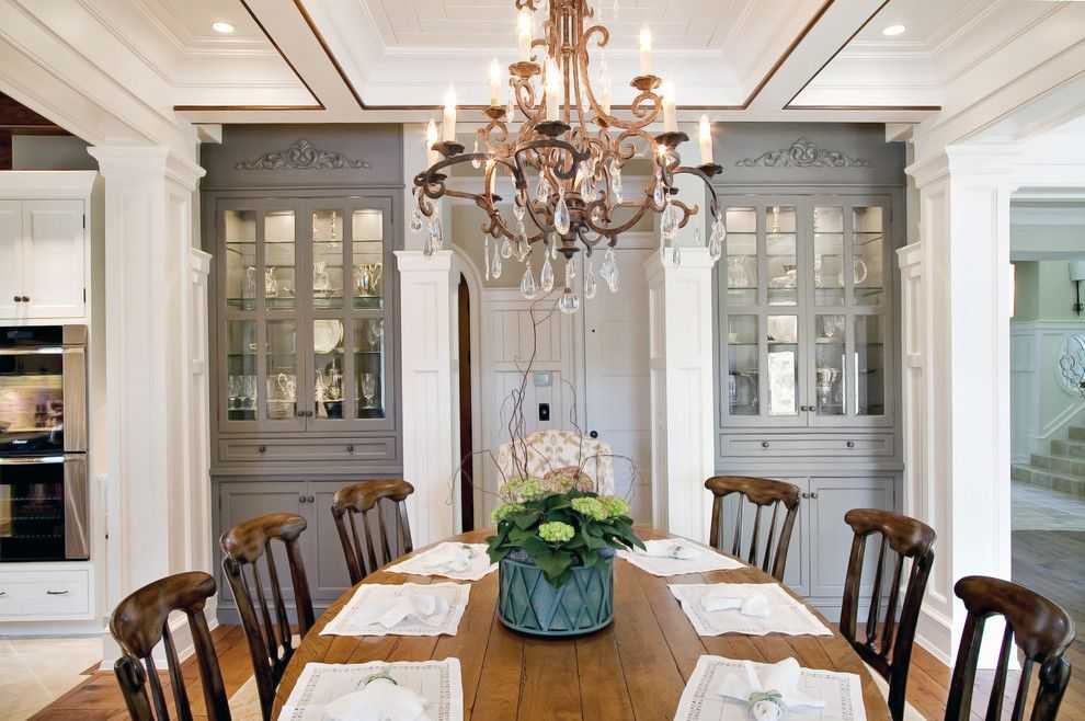 Вам нравится классическая столовая? Мебель для такой комнаты — простые формы, предпочтительно из массивной древесины, возможно, из металла, кованых элементов. Когда у вас нет нужного набора, то можете покрыть стол льняной скатертью, оформить стулья чехлами из белых или серых полотен. Посуда для размещения классической столовой — гладкая, белая керамика с современными или традиционными формами в сочетании с прозрачным бесцветным стеклом.