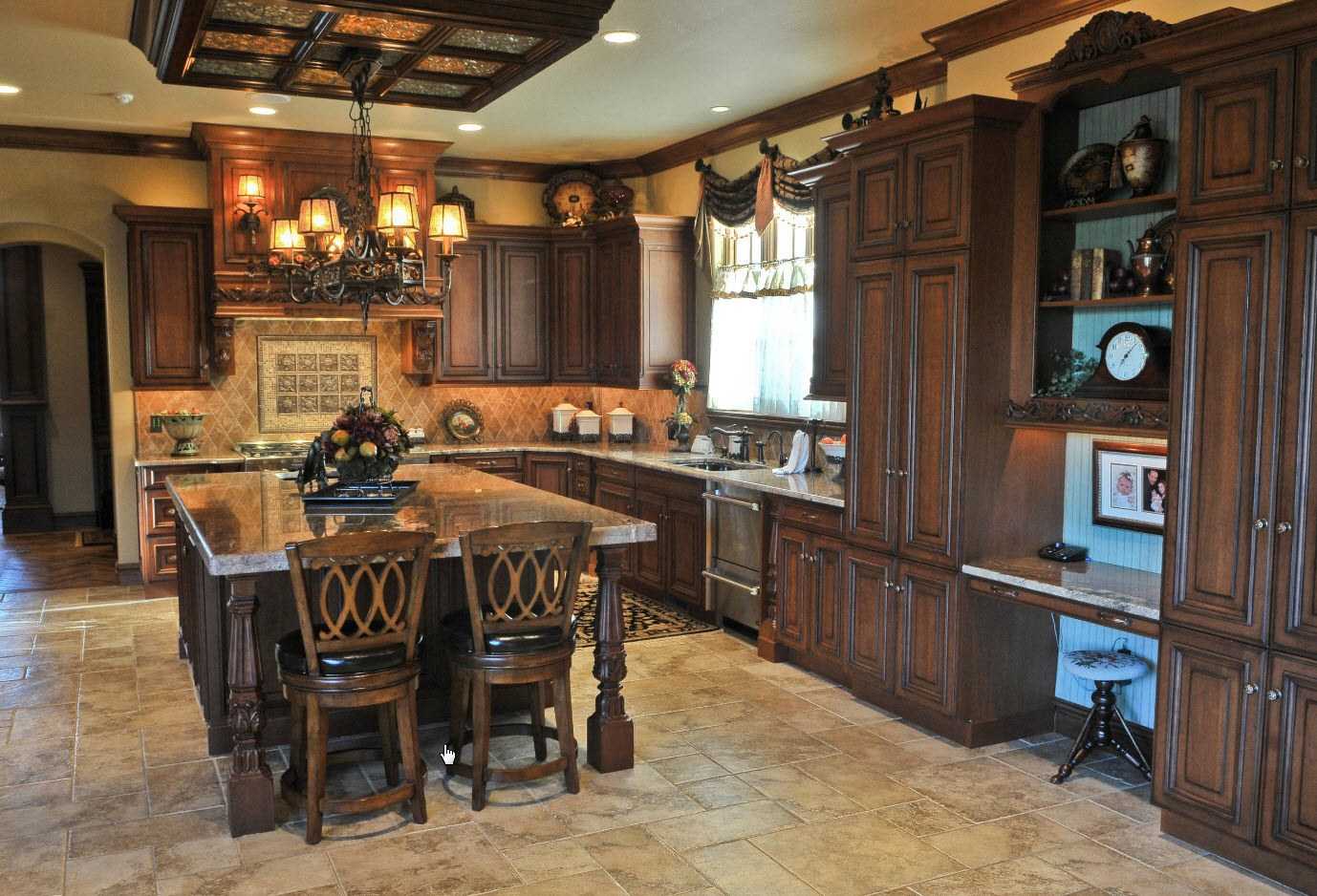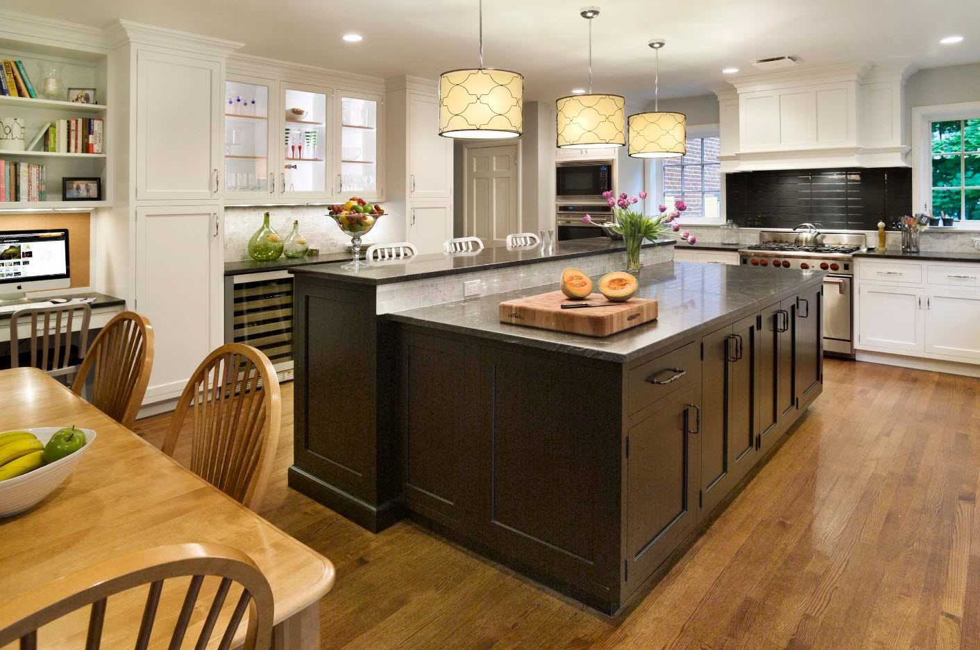 Для интегрирования в имеющееся пространство максимального количества бытовой техники, можно воспользоваться П-образным кухонным гарнитуром. Такой вариант выбирают большие семьи. В зависимости от того, какую форму имеет комната, в центре устанавливается обеденный стол. Он может быть прямоугольным или круглым.