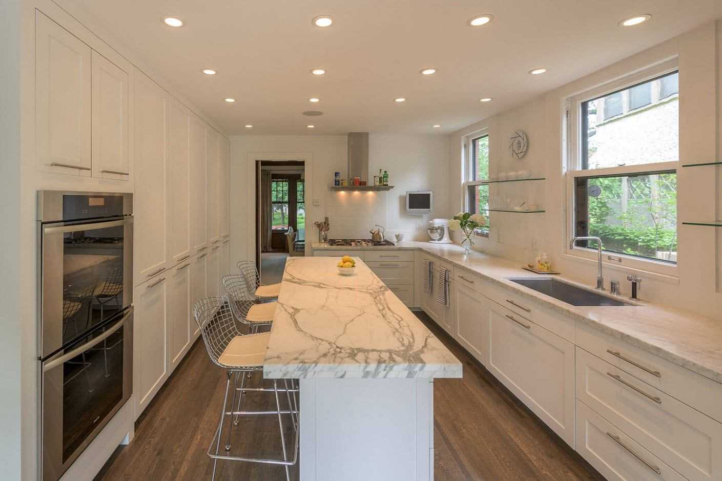 При установке кухонного гарнитура вдоль длинной стены, в помещении остается много свободного пространства. Оно оформляется в зависимости от размеров семьи и стиля жизни всех домочадцев. Одним просто необходим огромный обеденный стол. В то же время, другие предпочитают ужинать, сидя на высоких барных стульях рядом со стойкой.