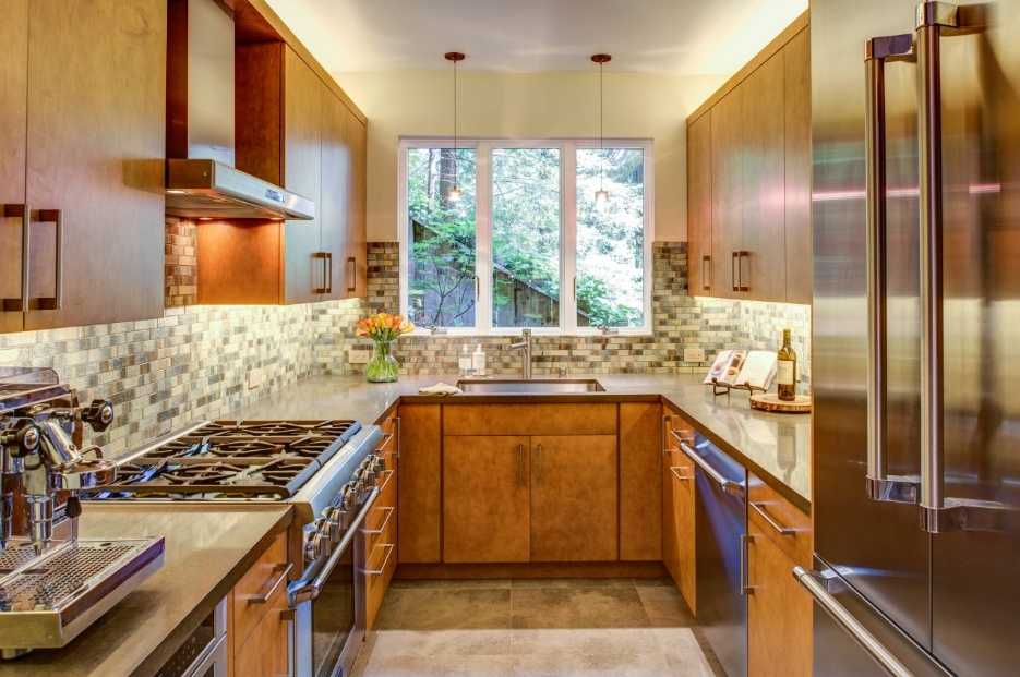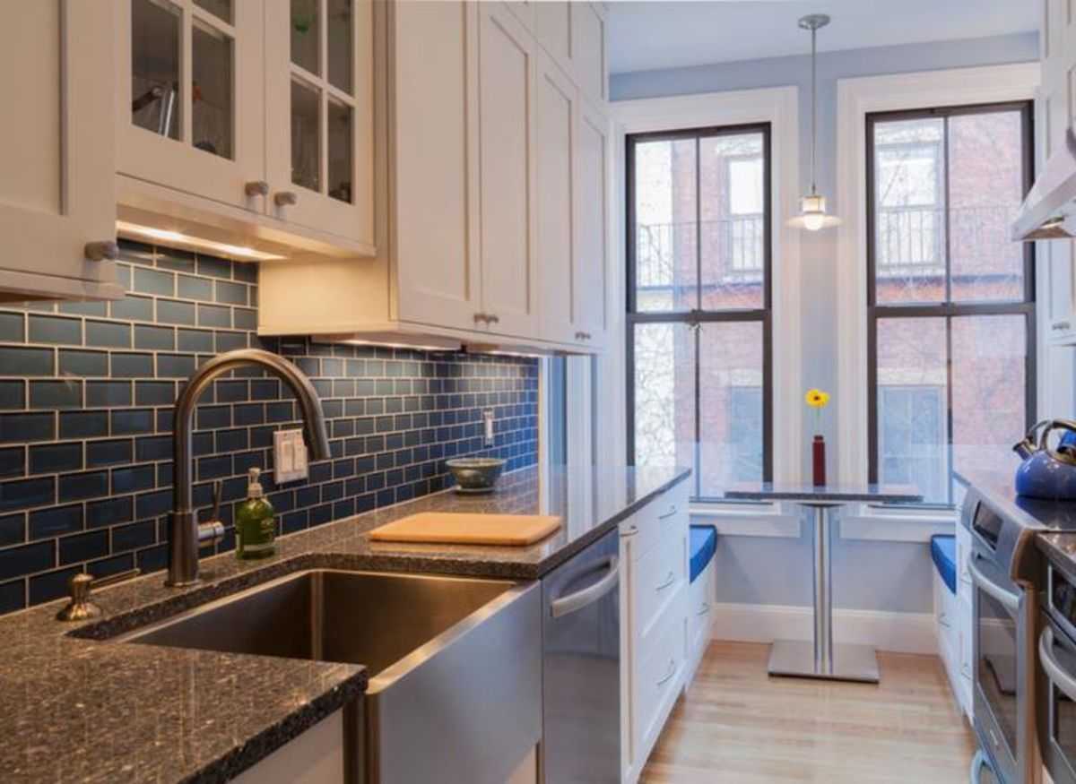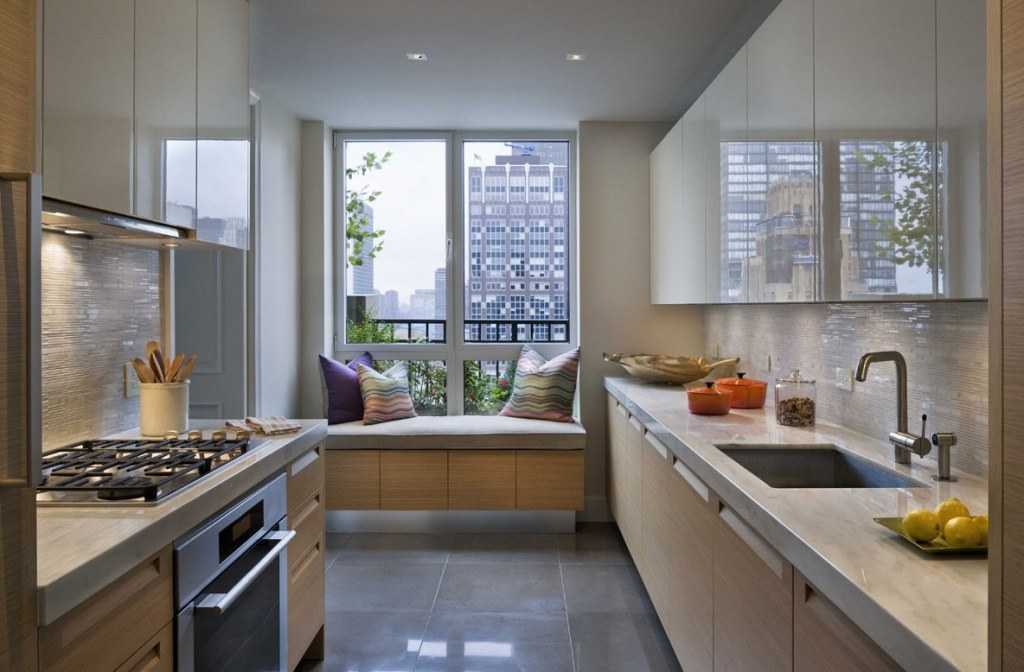 Дизайн узкой кухни с окном