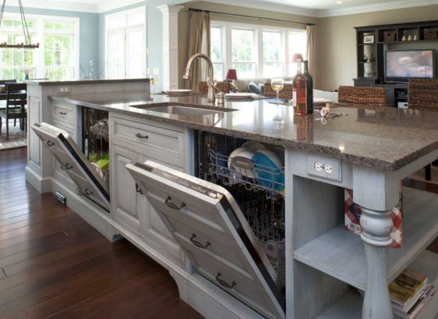 От остальных типов посудомоечных машин потенциальных покупателей отпугивает боязнь громоздкости, ляписного сочетания элементов и неудобство размещения элементов декора кухни.