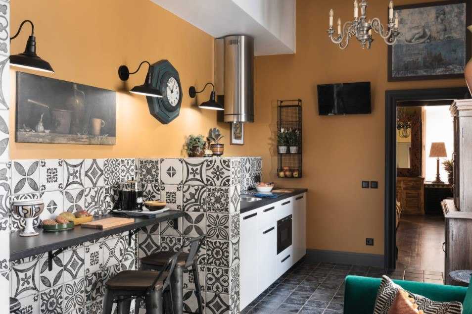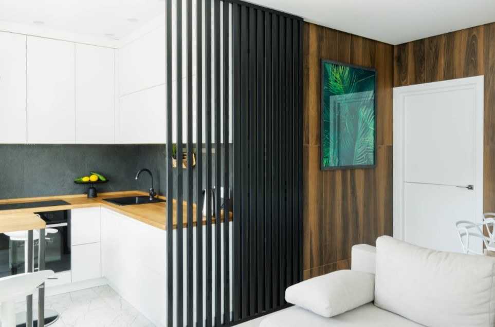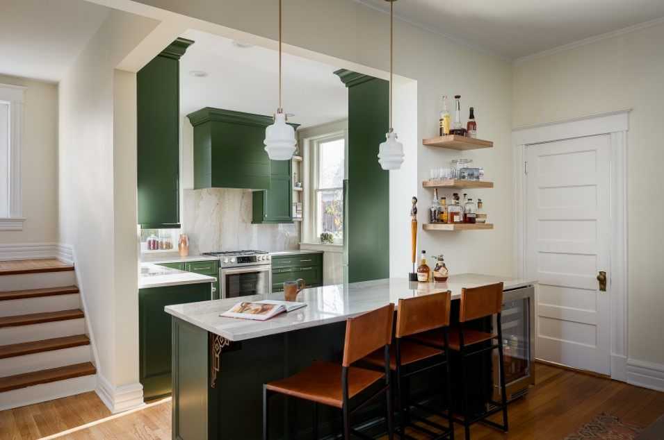 Установка барной стойки — оптимальный выбор для узкой кухни, где для обеденного стола не остается места. В такой ситуации небольшую барную стойку оборудуют у стены с окном, для удобства можно сделать ее откидной.