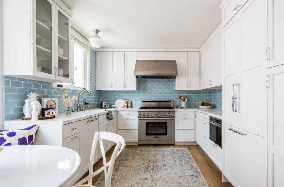 Все шкафчики должны максимально тянуться вверх, тем самым вытягивая пространство кухни. Визуально расширить помещение помогут горизонтальные полосы на стенах.