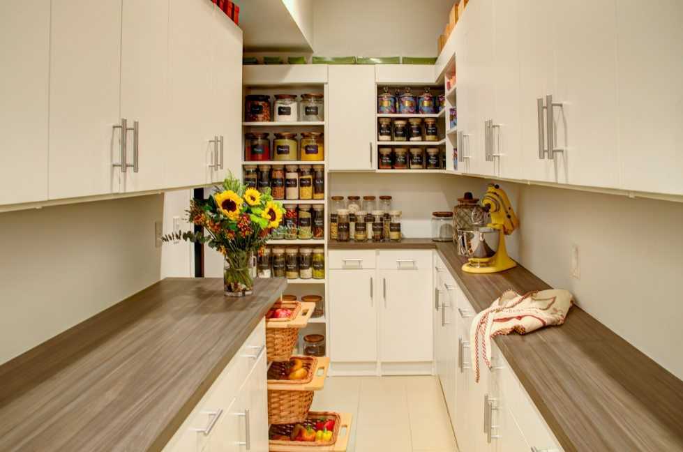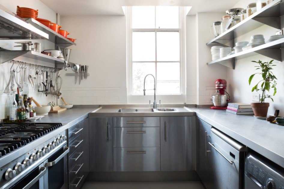 Чтобы помещение не выглядело слишком перегруженным мебелью и тесным, было комфортным и удобным не только для хозяйки, но и для всех домочадцев, рекомендуется использовать гарнитуры с высокими шкафами, глубокими нишами и множеством выдвижных ящиков, полочек и модулей.