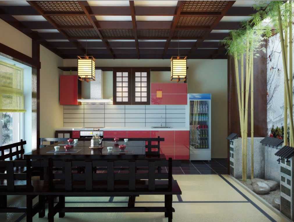 Дизайн строиться в стилистическую перспективу, на японской кухне вы никогда не уведите тяжелых штор.