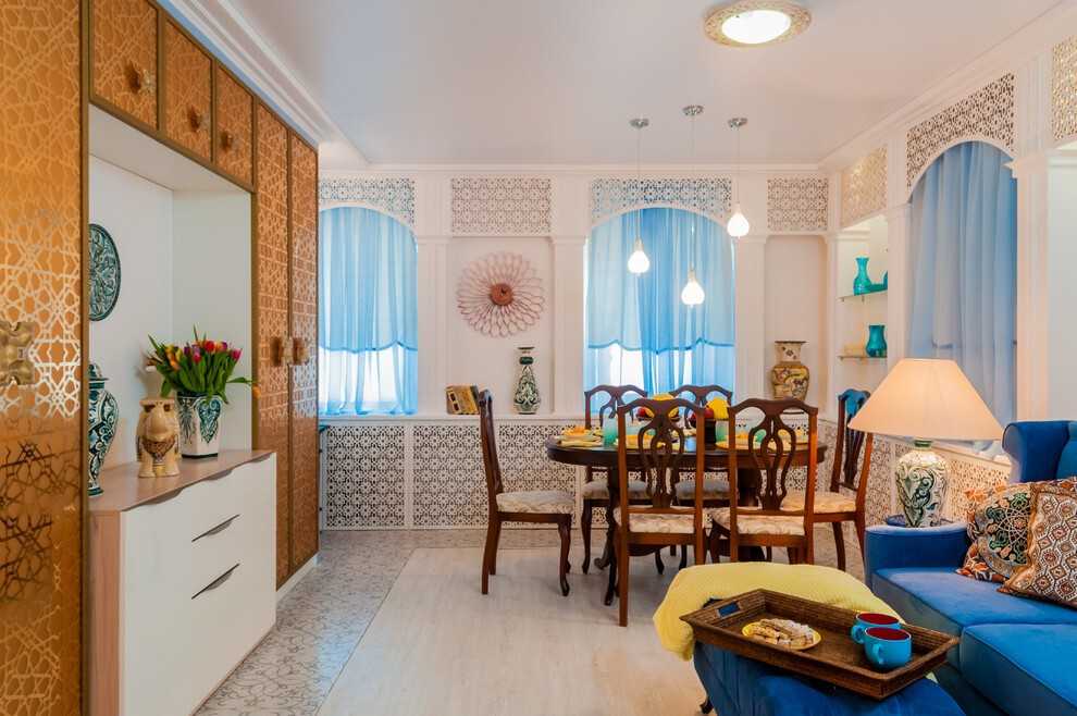 Пол в арабском стиле оформляют досками из дерева или керамикой. Натуральные материалы используемые в дизайне, прибавляют комфорта и самобытности. Плитка также служит хорошим способом отделки пола. Она легко моется, долго служит, а разнообразие оттенков и восточных узоров позволяет использовать ее в любом направлении.