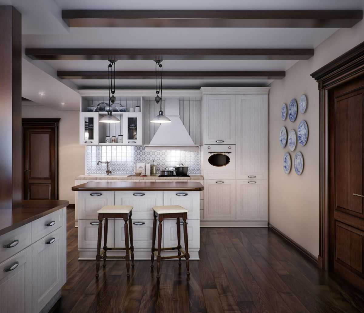 В интерьер кухни отлично впишутся украшения в виде деревянных балочных перекрытий. Оставьте их в исходной гамме или окрасьте в соответствии с палитрой кухни. Если высота потолков позволяет, располагайте балки так, чтобы образовалась конструкция со скосом.