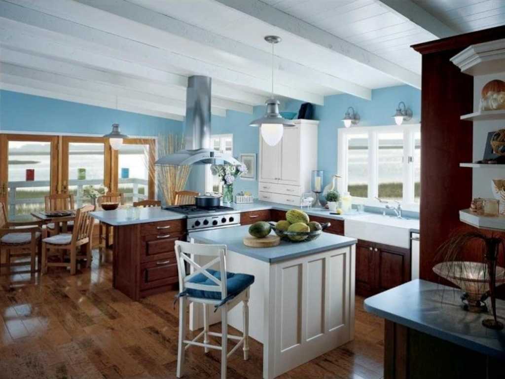 Если есть желание, частично можно поменять цвет фасадов. Перекрасьте их в светло-синий, бирюзовый или белоснежный оттенок. Такая гамма будет удачно гармонировать со светлыми сортами древесины. Отдельные кухонные зоны декорируйте ракушками, керамическими предметами или мелкими камушками.
