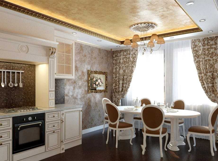 Неуместно будет выглядеть натяжной потолок. Все поверхности обязательно должны быть матовыми. Лепнина гармонично сочетается с колоннами, узорами на стенах и грубой фактурой необработанного камня. Основным принципом отделки потолка является простота и отсутствие лишних деталей. Люстра предпочтительно легкой конструкции смотрится дорого, но сдержанно.