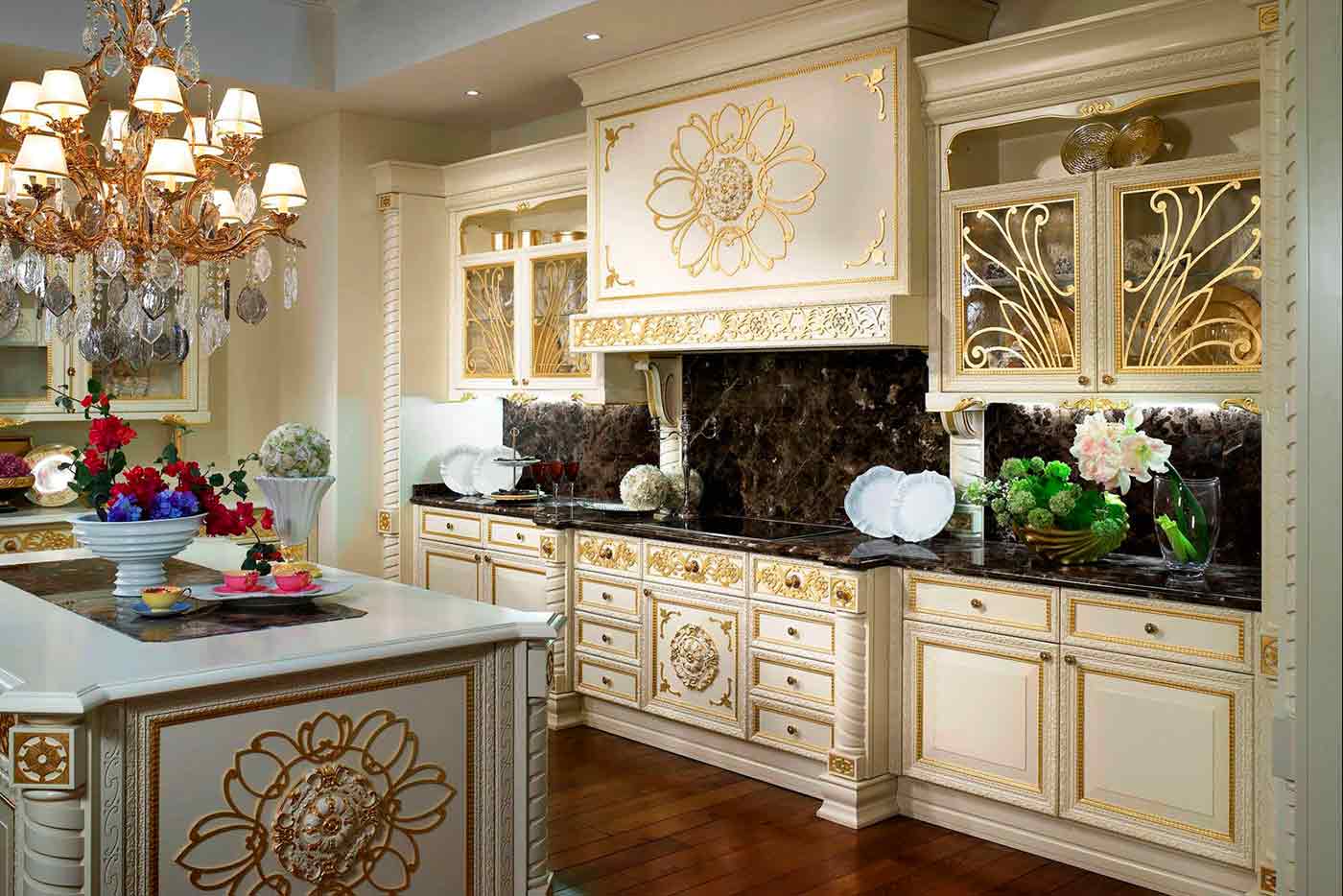 В таком кухонном интерьере зоны для готовки и приема пищи непременно должны разделяться. Выполнить эту задачу поможет большая стойка, выполненная в античном стиле.