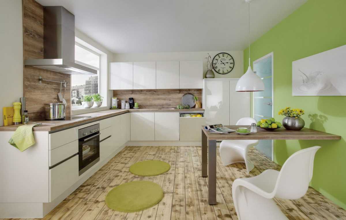 Это направление гармонично сочетает фисташковый с бежевыми или желтыми нотками. Добавьте в пространство кухни текстиль и мебель в этих тонах. Акцент делается на фисташковый, все остальные цвета идут в качестве дополнения.