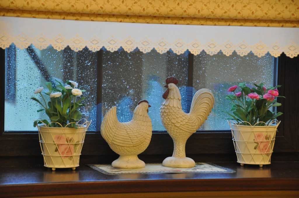 Не стоит забывать про украшения малогабаритной кухни петушками в виде картин или кованных статуэток. Уместно размещение декоративных связок овощей и фруктов, детских поделок.