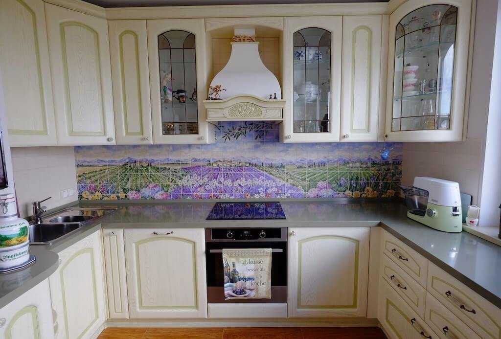 Фартук, больше похожий на фотообои, изображающий лавандовые поля на кухне 10 кв. м буквой П.