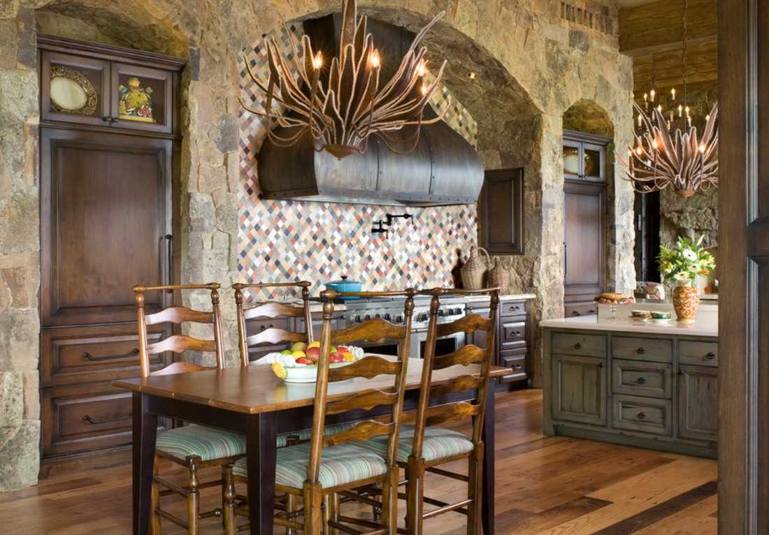 Для кухни подбирается прямоугольный обеденный стол из массива дерева, можно с перекладинами. В обстановку впишутся тяжелые деревянные стулья с удобными мягкими сиденьями. Обивка стульев неброская, возможно, с кожаными вставками и заклепками. Шкафы и комоды могут декорироваться резьбой. Если в кухне предусмотрена зона отдыха, ее заполняют плетеные кресла или комфортный массивный диван.