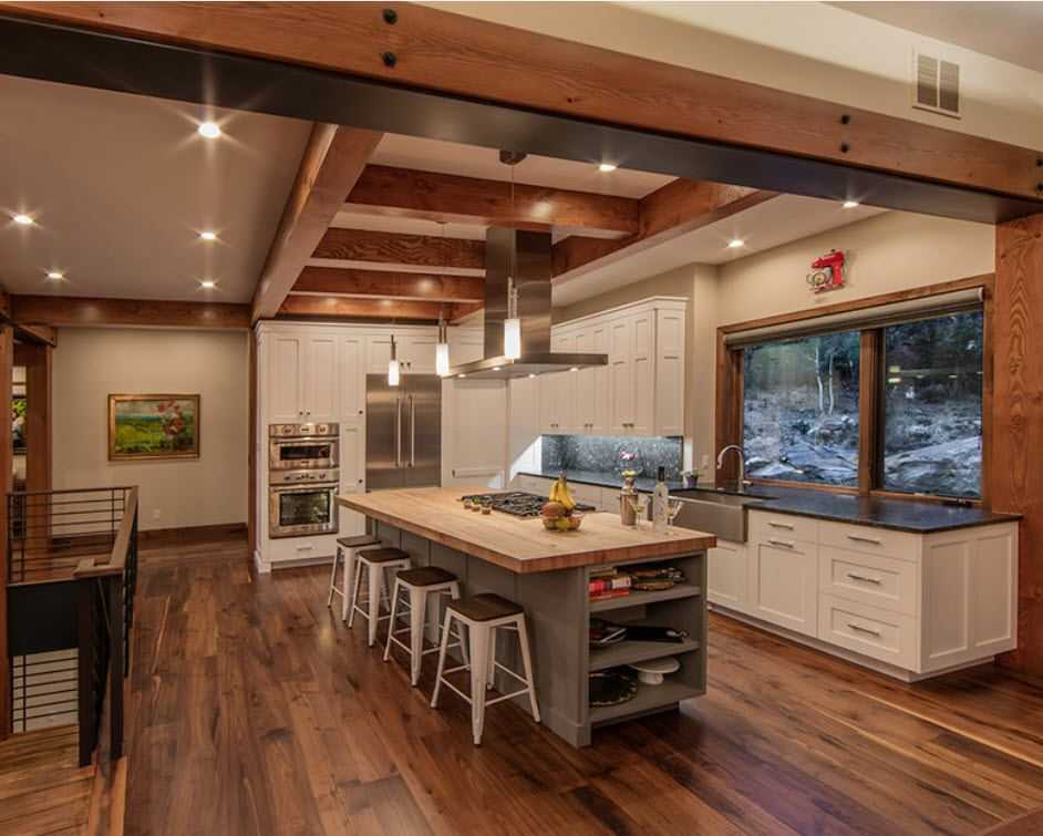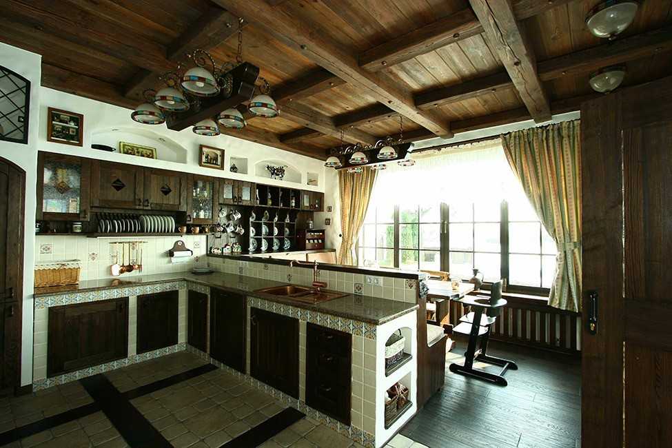 Основной атрибут потолочного оформления – балки. Если дизайн кухни в стиле шале оформляется в загородном доме, то установку балок необходимо учесть еще на стадии строительства. Если этот стиль применяется в городской квартире, то потолочный балки можно сделать «ложными» из полиуретановых элементов.