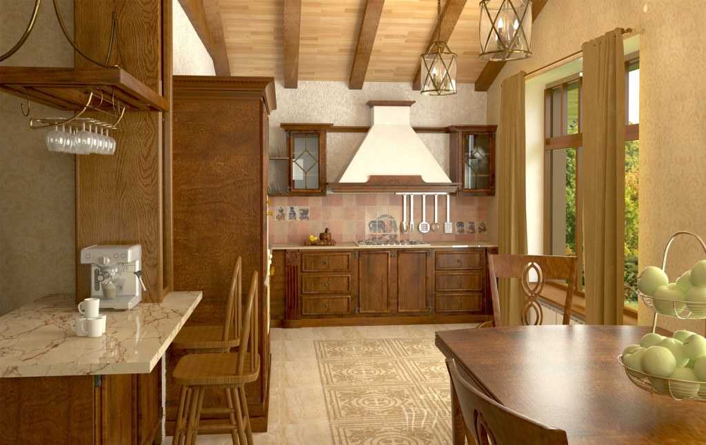 В этом стиле должна использоваться исключительно деревянная мебель для кухни, и это касается не только фасадных частей, но и рабочей поверхности.