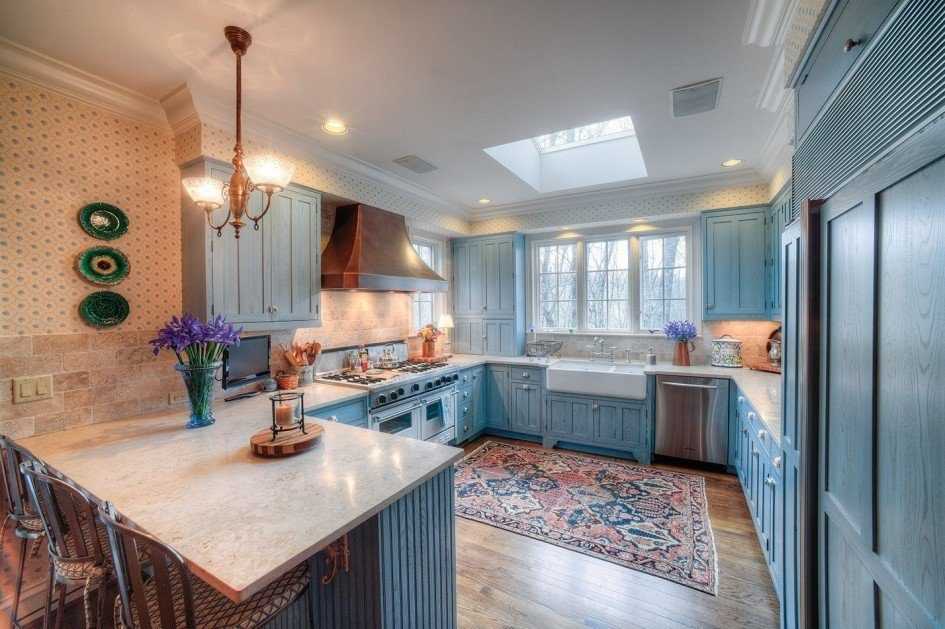 Несмотря на то, что кухонные гарнитуры относятся к более современной мебели, допускается их установка и в таких традиционных интерьерах. Желательно остановиться на негабаритных моделях, которые не будут занимать максимум площади кухни.