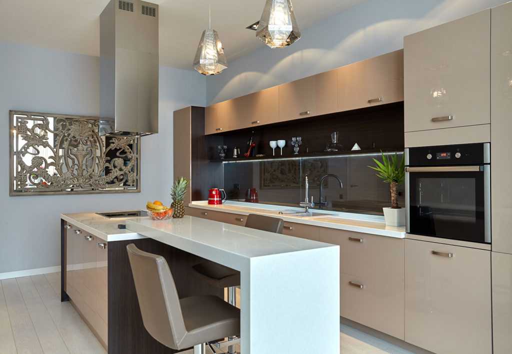 Встроенная в гарнитур барная стойка может быть выше уровня столешницы.
