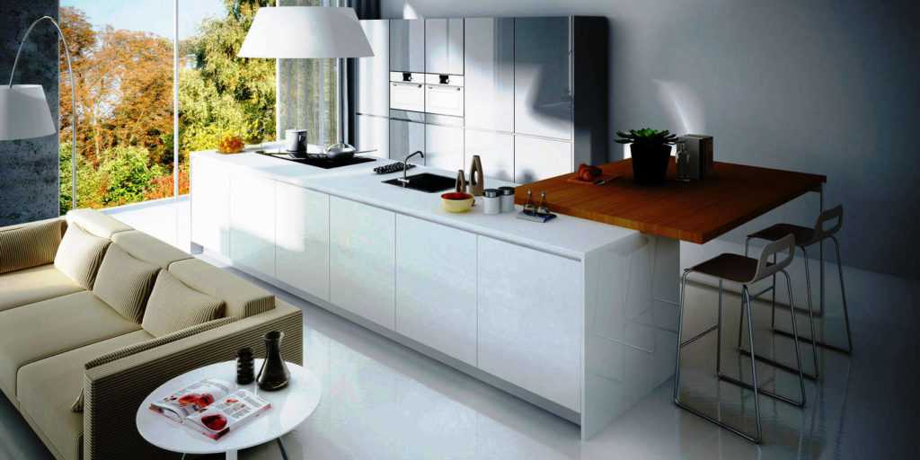 Встроенная в гарнитур – стойка, встроенная в Г- или П-образный гарнитур и переходящая в кухонную столешницу. При этом она может размещаться и у окна, и вдоль стены, использоваться и как полуостров, и как дополнительная рабочая поверхность.