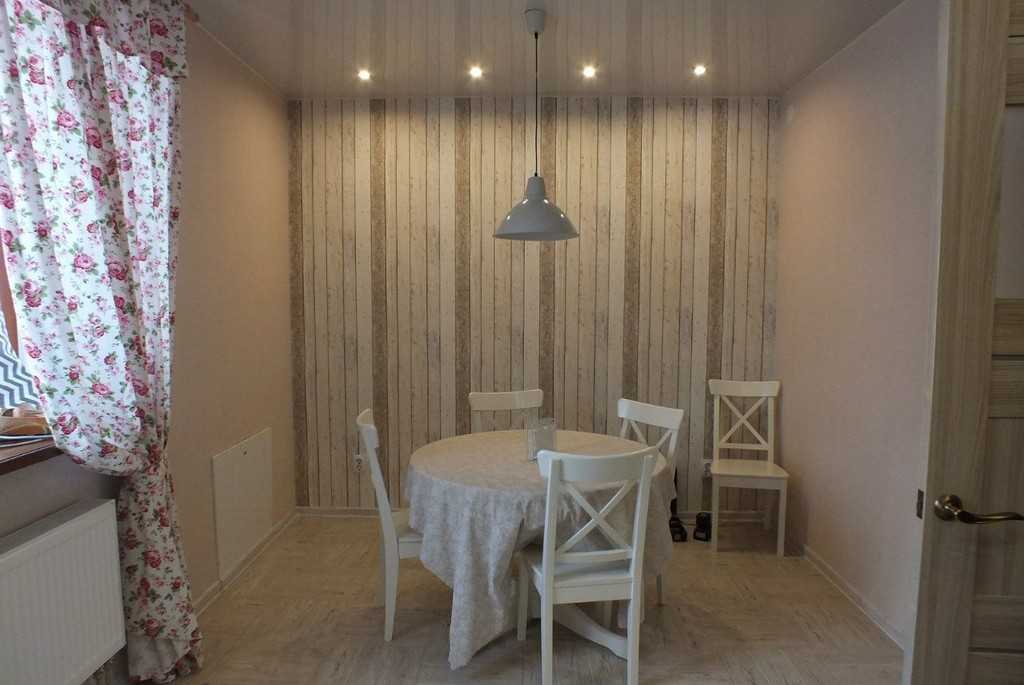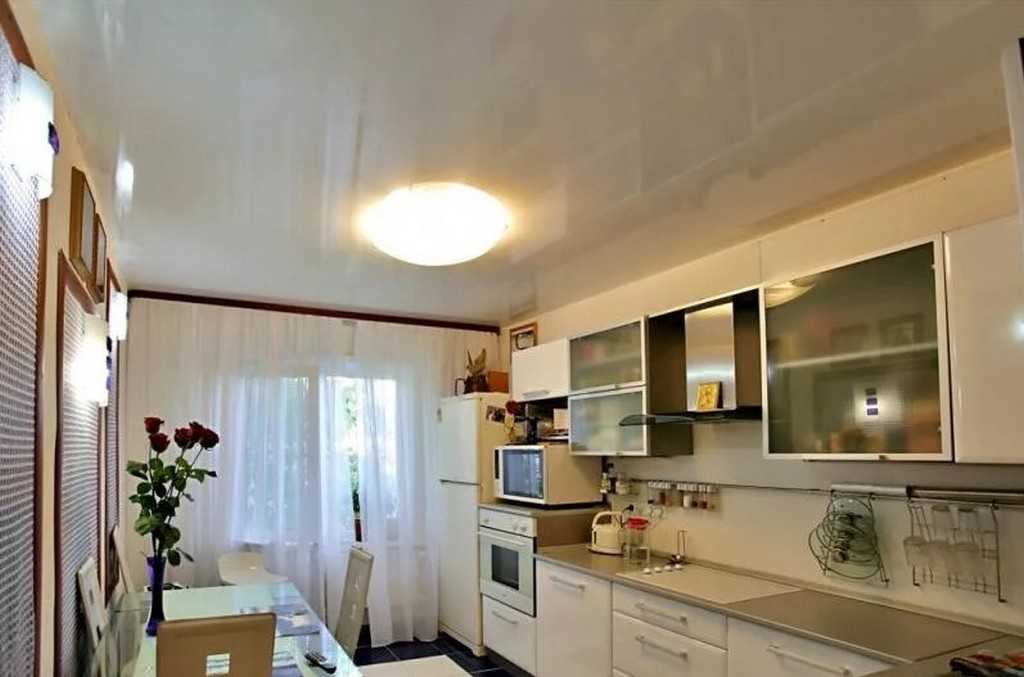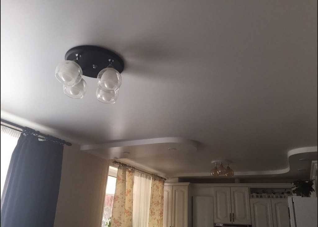 Но встречаются и другие варианты освещения — например, на кухне с натяжным потолком часто можно встретить сразу несколько плафонов в ряд, подвешенных аккурат над обеденной зоной.