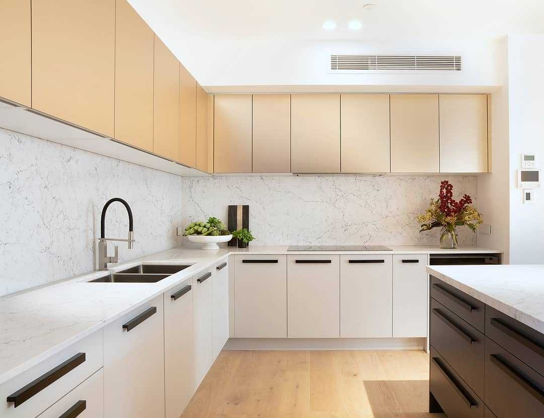 Вершины из них — полированный бетон, темный мрамор, кварц, сталь, стекло и конгломерат, все они соответствуют современным тенденциям. Последние, называемые «твердой поверхностью«, дают широкие возможности для создания интерьера. Их параметры гарантируют длительное бесперебойное использование. Одним из открытий, когда дело доходит до материала для кухонной рабочей поверхности, является терраццо , которое уже появилось в интерьерах, но в основном на полах.