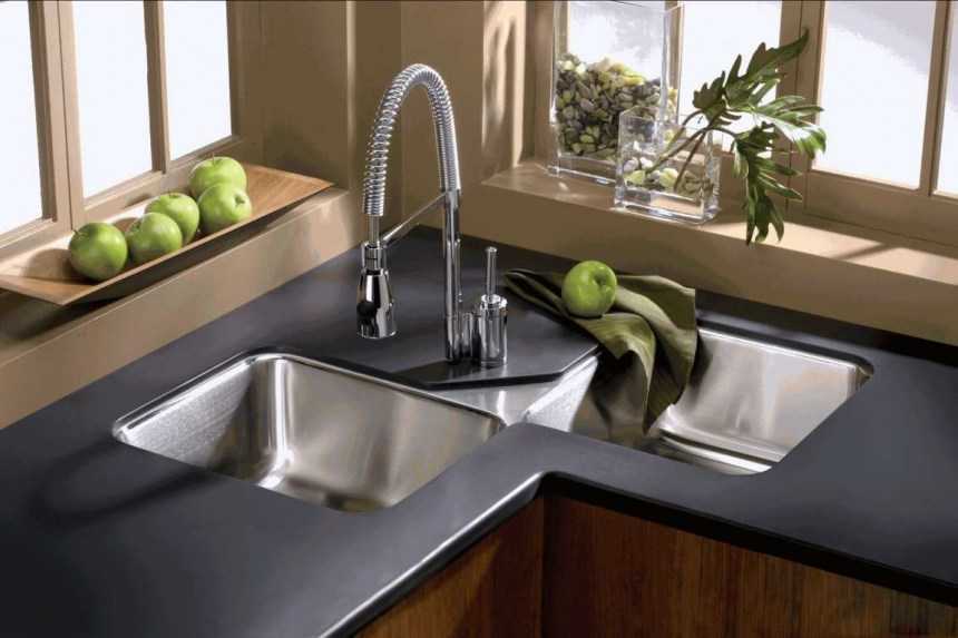 Искусственный камень. Материал смотрится солидно. Преимущества в высокой прочности, простоте в уходе, стойкости к ультрафиолетовому излучению, химическим средствам и высоким температурам. Изделия из искусственного камня приглушают шум воды, производятся в разных формах и цветах, идеальны для каменных столешниц. Основной недостаток материала – цена. От красителей на камне могут появиться пятна, а из-за кипятка трещины. Возможны сколы из-за тяжелой посуды, но это исправит реставрация.