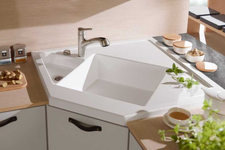 Керамика. Выглядит красиво, уместна в классической обстановке. Керамическая мойка в углу кухни может быть белой или цветной, иметь рисунок. Плюсы в устойчивости к высоким температурам, химическим воздействиям, стойкости к царапинам, несложном уходе. Есть и минусы – хрупкость, риск сколов и трещин, большой вес.