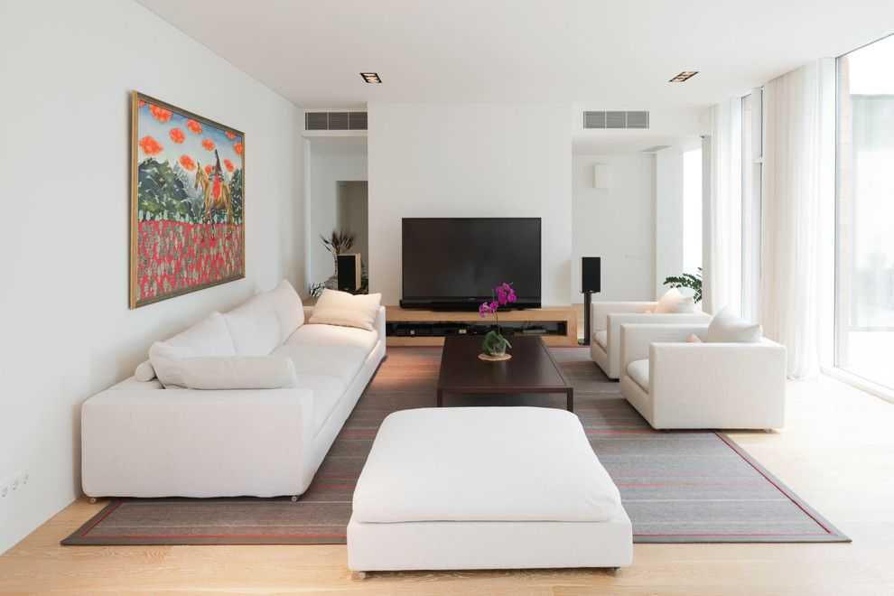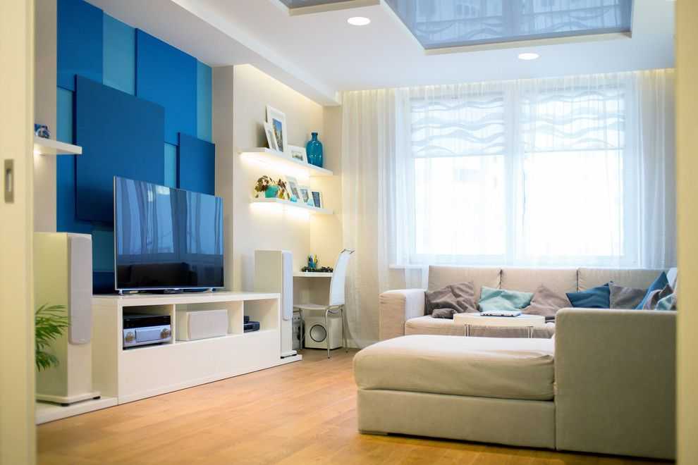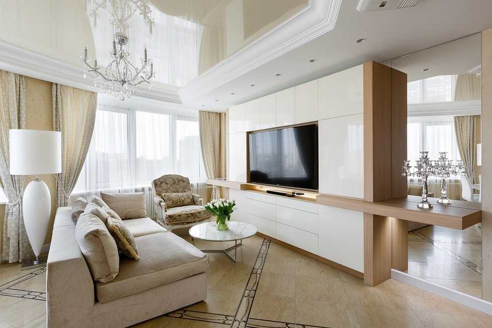 Классический белый потолок. Идеальным выбором для многих интерьеров зала является чисто белая расцветка. В этом случае вы получите эффективный блеск, который освещает интерьер. Такой потолок будет хорошо сочетаться со скандинавскими и минималистическими интерьерами.