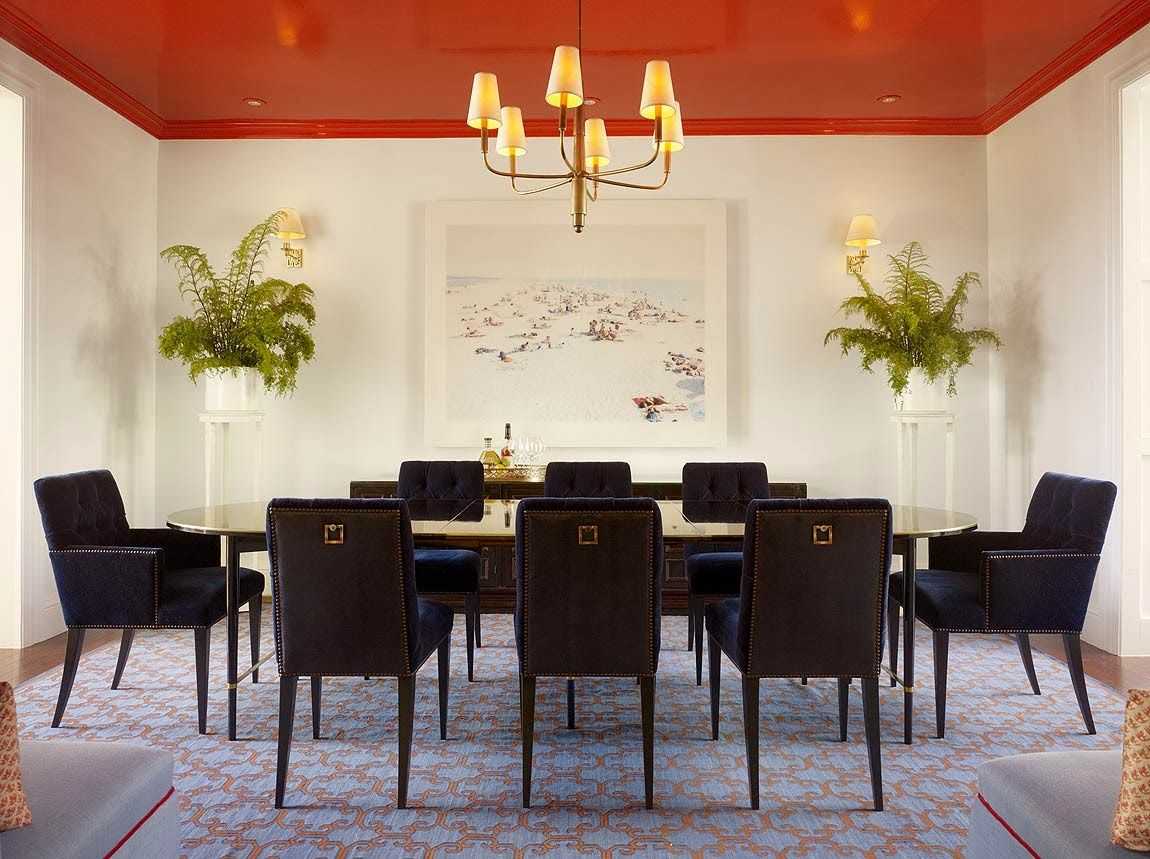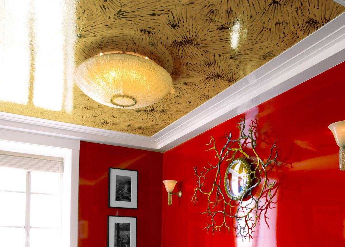 Потолок красного цвета. Потолок, растянутый в интенсивном красном цвете, является отличной идеей для решительных людей, которые любят экспериментировать в дизайне комнат. Он, несомненно, выглядит оригинально. Просто помните, что если такой сильный цвет будет на потолке, стены, мебель и техника в зале должны быть в приглушенных светлых расцветках, например, в оттенках белого или серого.