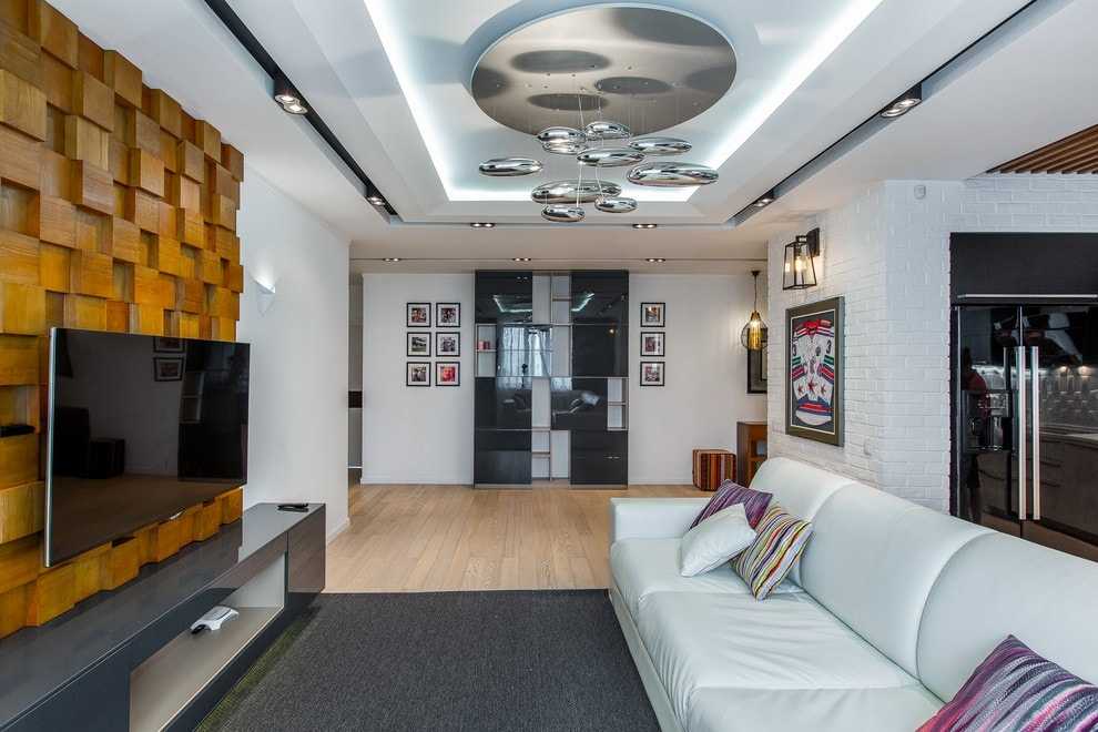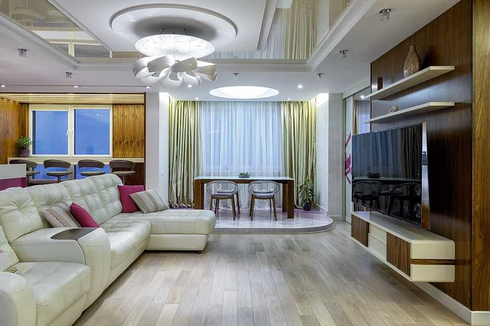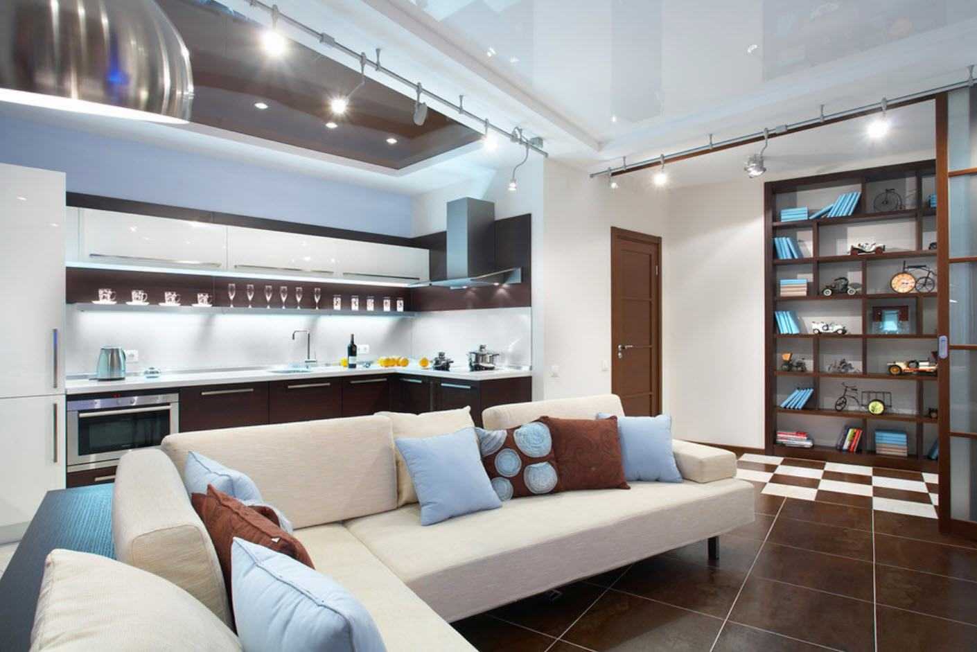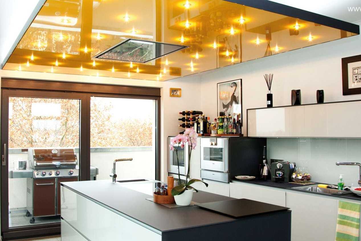 Практичный декор: дизайн натяжного потолка в кухне-гостиной