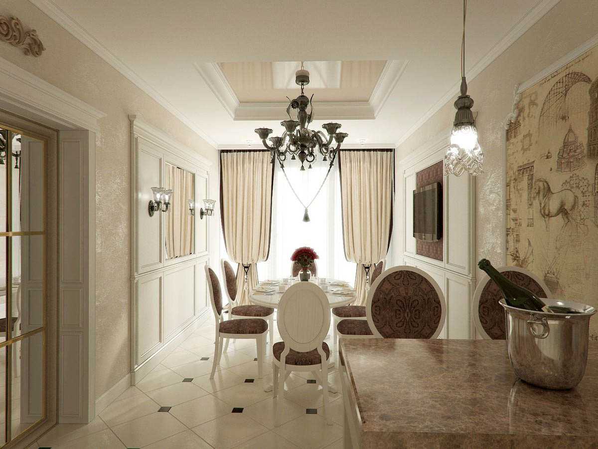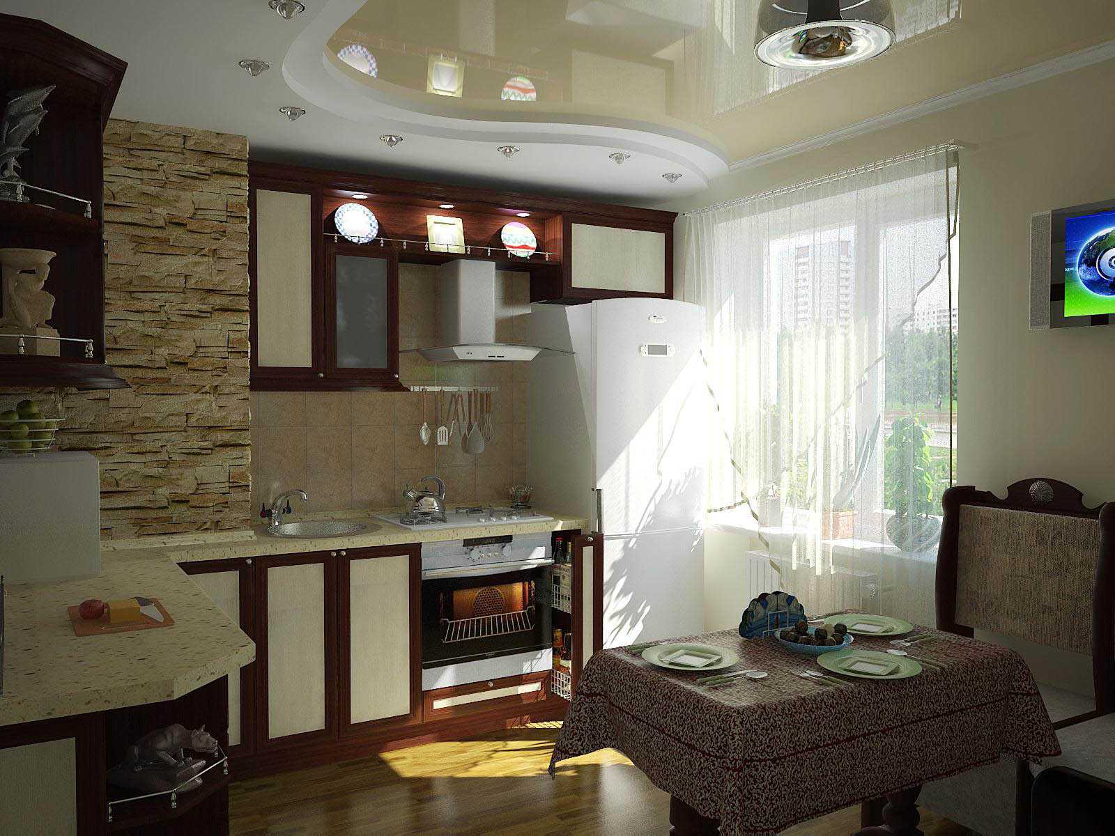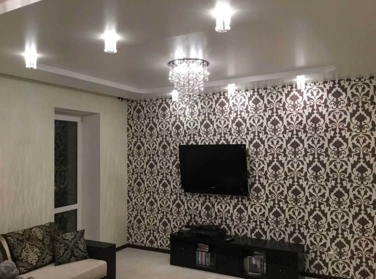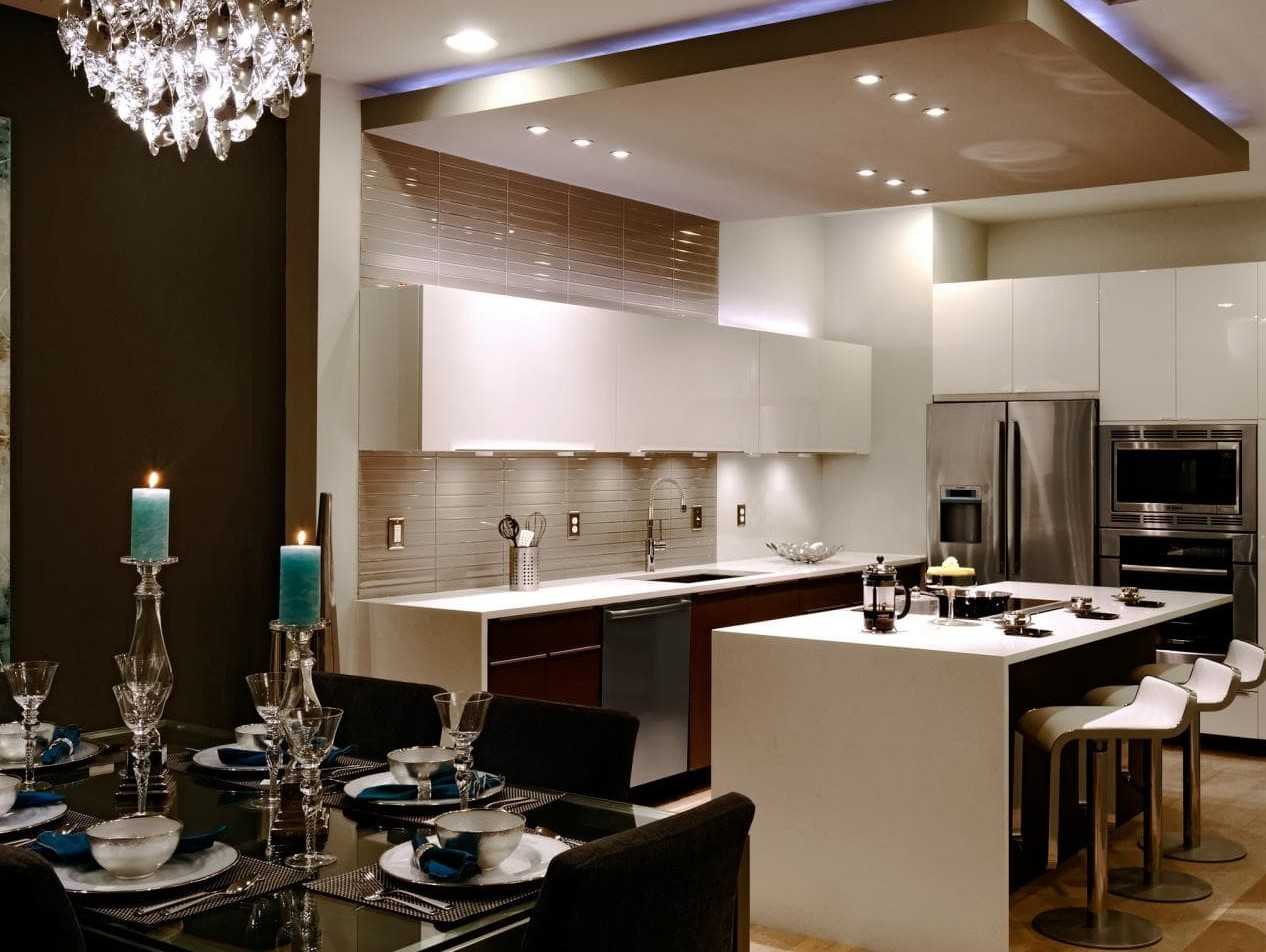 Практичный декор: дизайн натяжного потолка в кухне-гостиной
