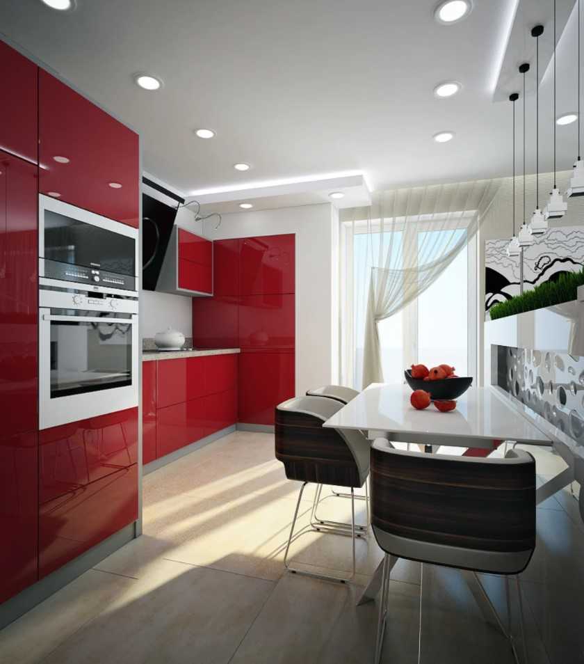 Если пространство большое, уместен будет многоуровневый потолок с выделением зон, которые можно подчеркнуть рисунком. Поскольку кухня — часто место не только готовки пищи, но и ее приема, нужно помнить о том, как цвета влияют на аппетит.
