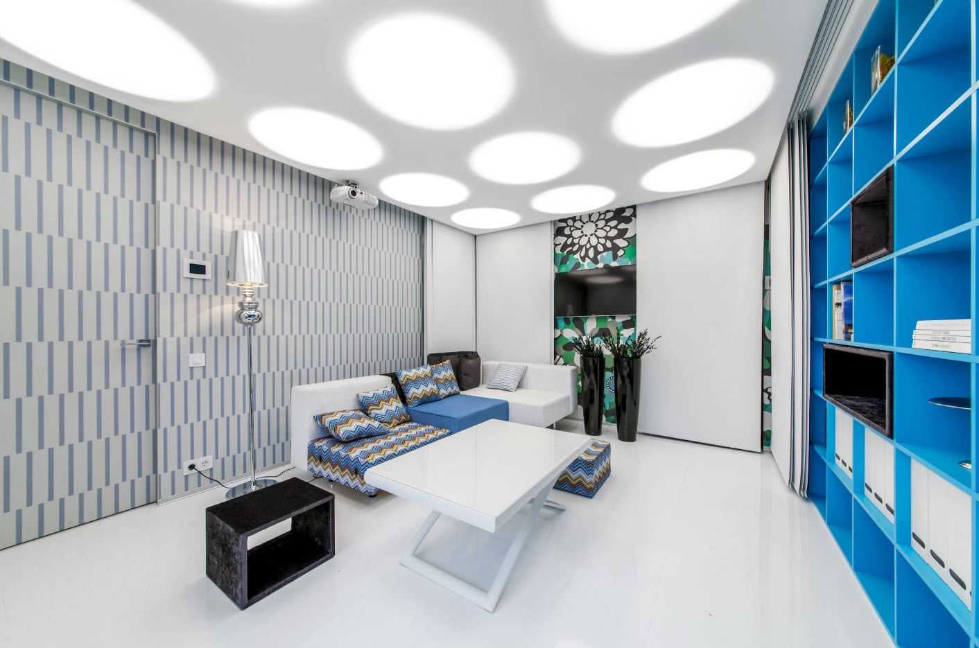 Светящийся потолок. Если вам трудно выбрать освещение в гостиной, то следует задаться вопросом, нужно ли выбирать люстру или галогены? Благодаря использованию прозрачной (полупроницаемой) фольги источником света может быть сам потолок, который будет сиять по всей поверхности. Условие заключается в размещении светодиодов над ним.