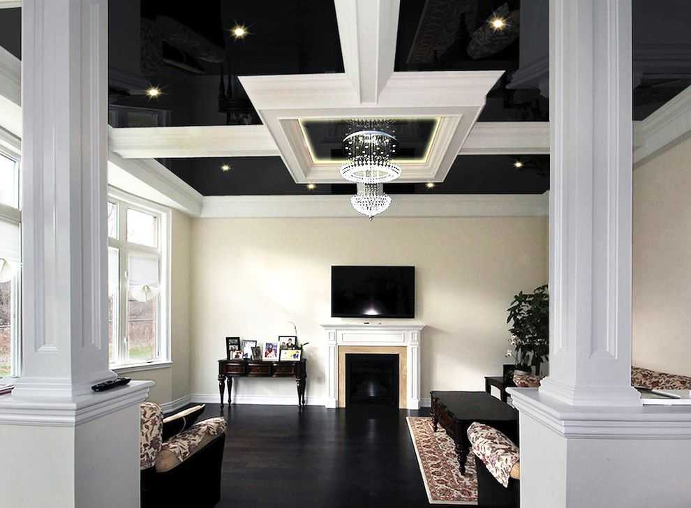 - Белый и чёрный (как правило, глянцевый) — классический, строгий и стильный вариант. Самый контрастный, но при этом сочетается с другими цветами в обстановке. Впечатление многоярусного потолка наиболее полное.