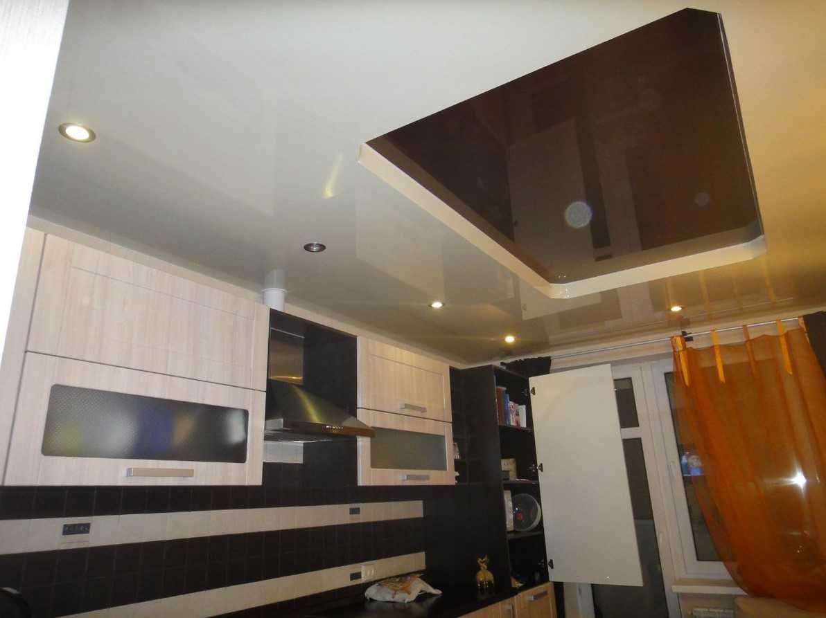 Существует множество комбинаций одноуровневых двухцветных натяжных потолков. Они различаются по форме частей, выбранным тонам и фактурам.