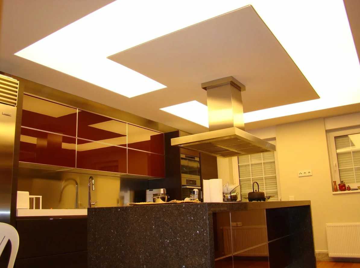 Под натяжными потолками подразумевается разновидность подвесных конструкций, которые крепятся к поверхности при помощи каркаса, полностью или частично перекрывая ее слоем полотна. Существует два вида материи — ПВХ-пленка и ткань. Последний крайне редко используют в пространстве кухни: он обладает свойством поглощать запахи, испарения и влагу. Зато поливинилхлоридное покрытие устойчиво к специфическим условиям в помещении, благодаря хорошим характеристикам и практическим свойствам.