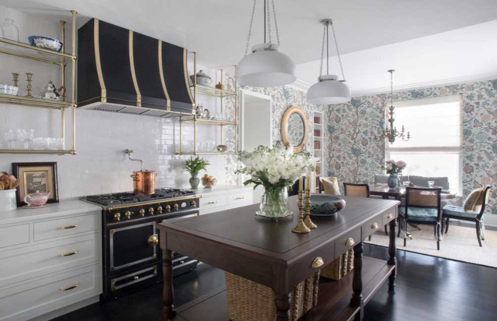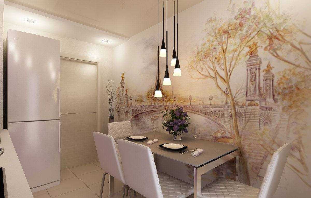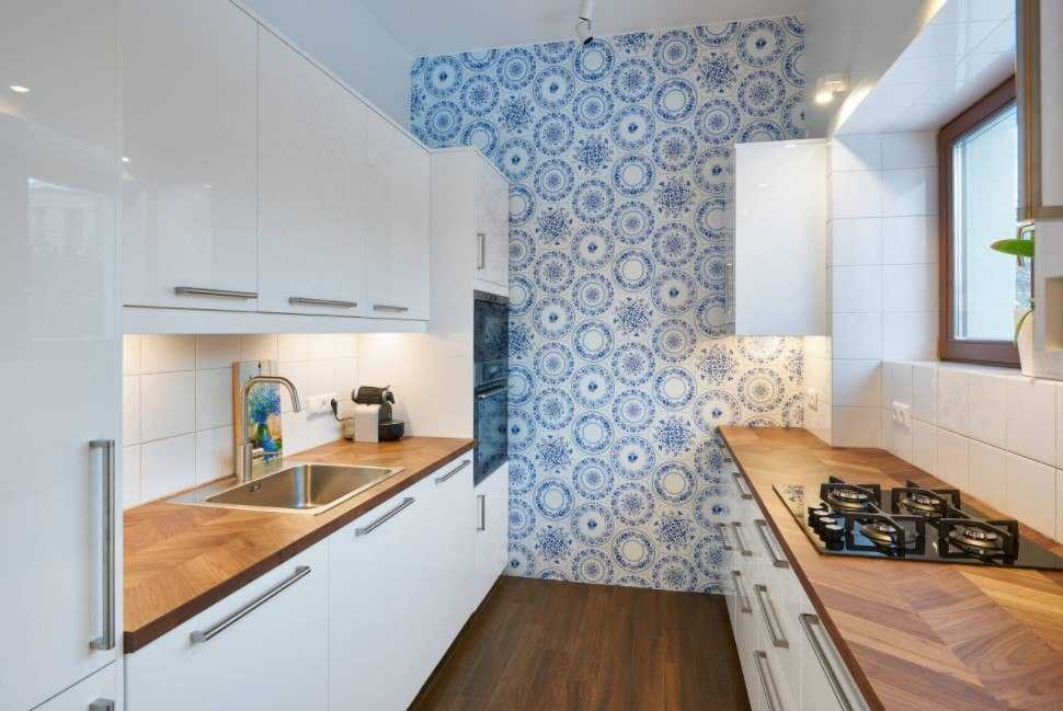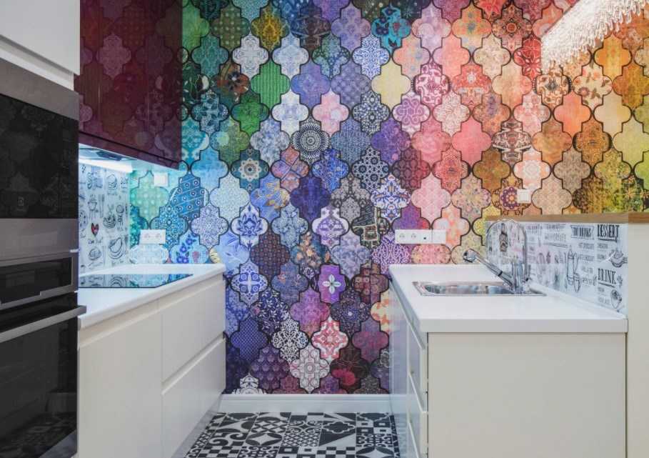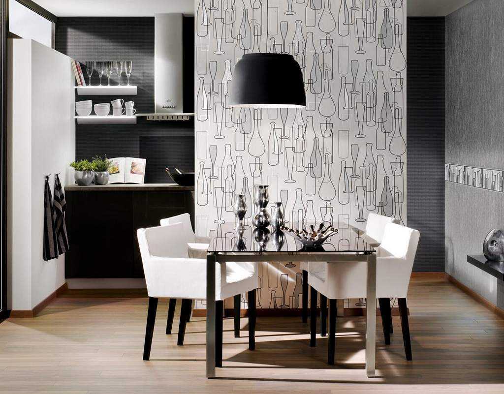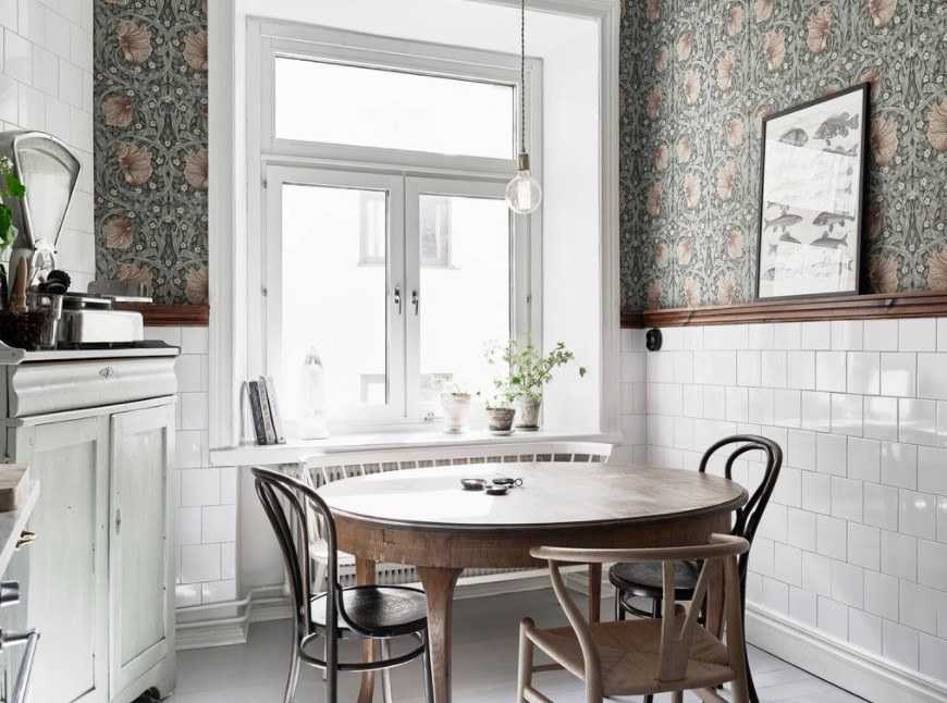 Для любителей более насыщенных красок можно использовать обои ярких тонов. Что касается принтов, то идеальным решением для кухни станут обои с живописными пейзажами, ажурными вензелями, узорами, имитирующими кирпичную или каменную кладку, а также изделия с геометрическими и цветочно-растительными мотивами.