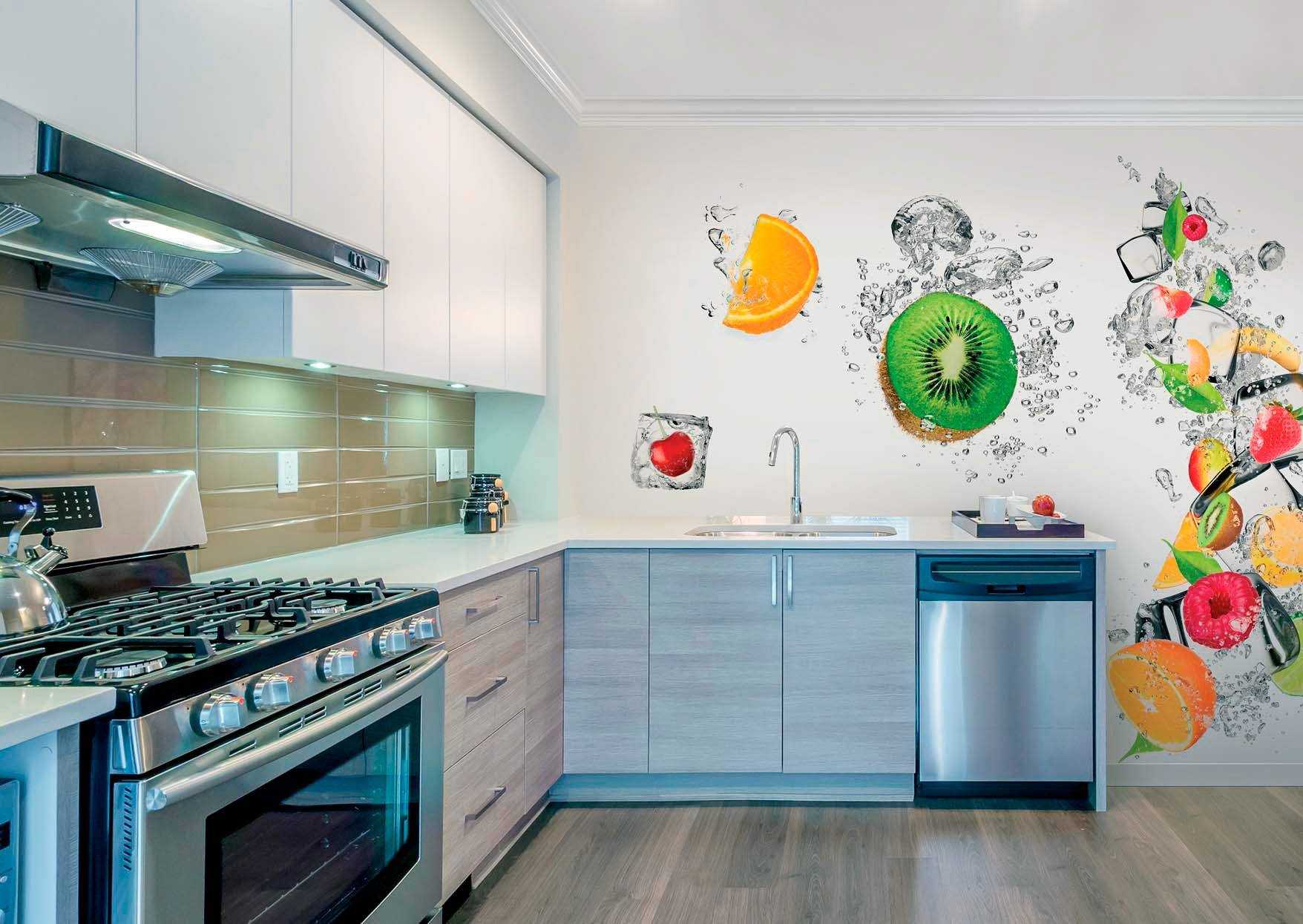 Для кухни следует выбирать жидкие обои, которые после полного высыхания способны отталкивать влагу. В противном случае их следует наносить на стены, противоположные от рабочей зоны и поверхностей кухонного гарнитура.