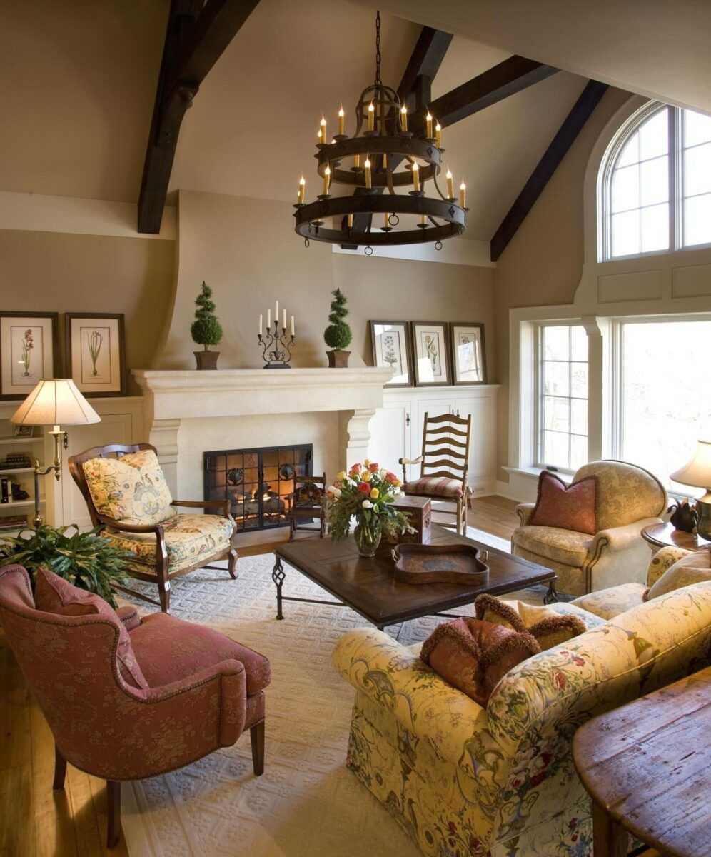 Правильная меблировка очень важна для расстановки правильных акцентов в этом помещении. Основными предметами мебели в дизайне гостиной являются: несколько кресел, компактный диван, кофейный столик и, конечно, камин, который выполняет не только свое прямое предназначение, но и служит стильной полкой для расстановки фотографий, картин, подсвечников и других аксессуаров.