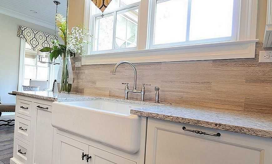 Поверхность над кухонной столешницей должна быть особенно устойчива к влаге, высоким температурам, а также к пятнам, в том числе жирным. Поэтому стоит выбирать плитки с большим слоем эмали, и если вы выбираете другие варианты отделки, не забывайте правильно пропитывать, чистить и периодически обслуживать материал. Плитка должна быть выбрана в соответствии со стилем, в котором оформлена кухня, с учетом цвета столешницы, мебели или пола. Не забудьте спланировать способ отделки поверхности над столешницей, также предусмотрите отверстия для электрических розеток.