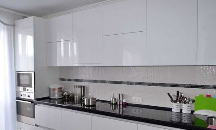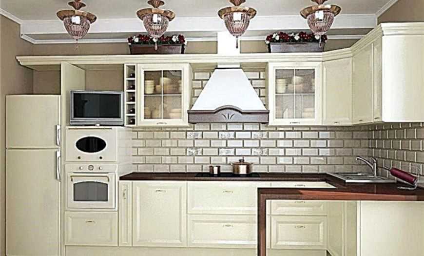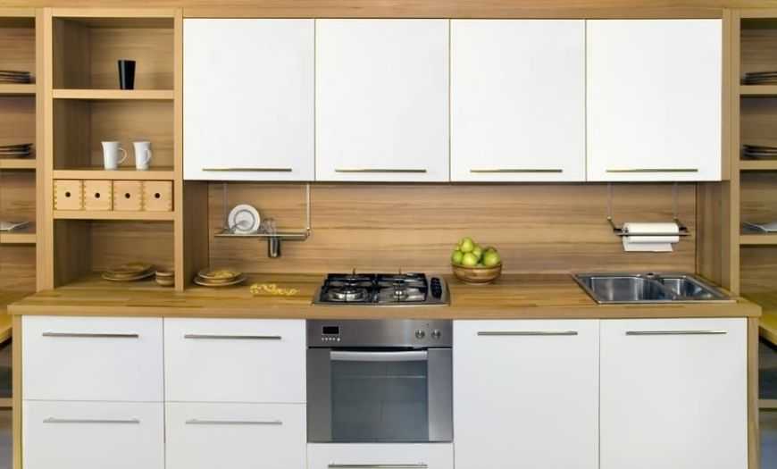 Учитывая, что в маленькой кухне пространство ограничено, для его визуального расширения необходимо использовать светлые тона, где светлый гарнитур будет давать целостную картинку со светлым фартуком.