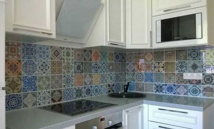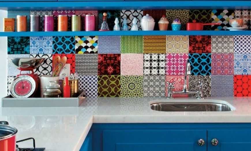 Другое название облицовки пэчворк — лоскутное одеяло. Сочетают разноцветные модули сочных оттенков, что делает фартук ярким и пестрым. На большой площади такая отделка вызывает раздражение, но на малой она вносит в интерьер приятное разнообразие.
