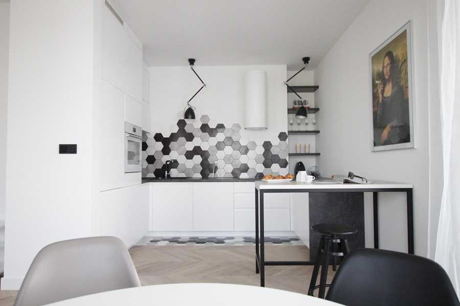 Керамическая плитка является традиционным и все еще популярным решением. Лишь несколько лет назад преобладала плитка формата 10×10 см, а в настоящее время в современных кухнях набирают популярность крупные форматы керамической плитки, полированного керамогранита, уложенного на тонкие швы, структурные плитки или шестиугольники.