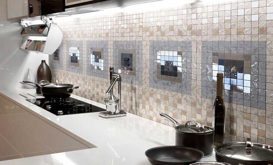 Мозаика может использоваться в сочетании с обычной плиткой в качестве окантовочного материала или создания акцентной композиции для выделения участка стены. Мозаика сделает визуально просторнее небольшую кухню.