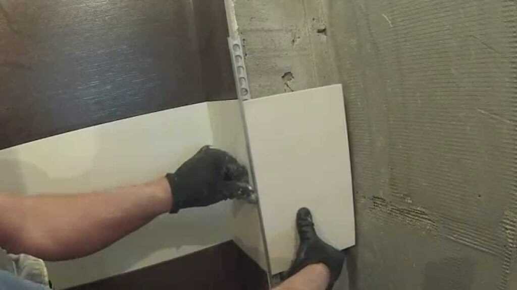 Выполняя подрезку торца, не всегда получается уклон 45° — лишнее стачивается вручную наждачкой с мелкой фракцией. Когда получился неровный стык, устранить проблему можно двумя способами: зазор замаскировать цветной затиркой или после схватывания смеси на внешний угол при помощи жидких гвоздей или силикона прикрепить декоративный профиль.