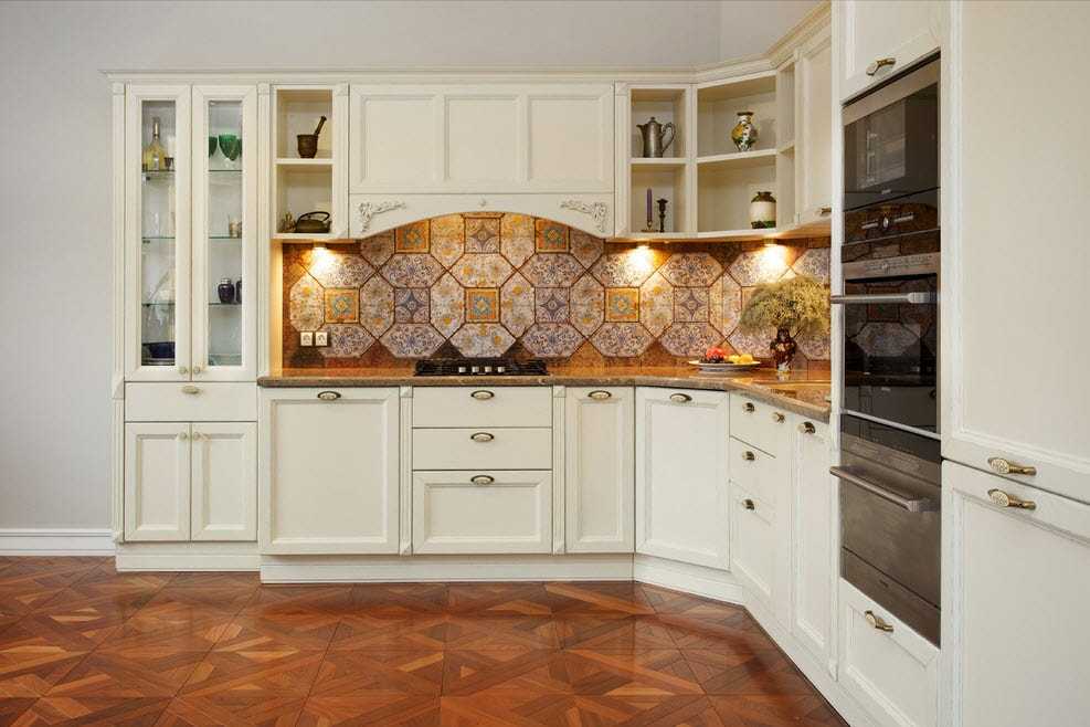 Для отделки пола возле рабочего места лучше всего подойдет керамическая плитка. Но не скользкая глянцевая, а матовая с рельефной структурой. В ассортименте представлено такое множество расцветок и текстур, что подобрать подходящие под оформление кухни будет несложно. Эффектно смотрится сочетание плитки и ламината с изображением мрамора, известняка, дуба, бука.